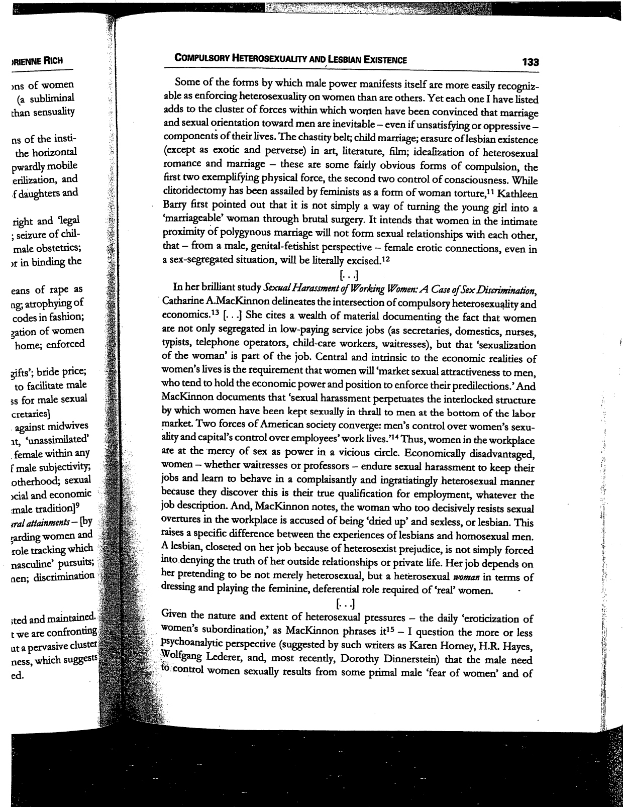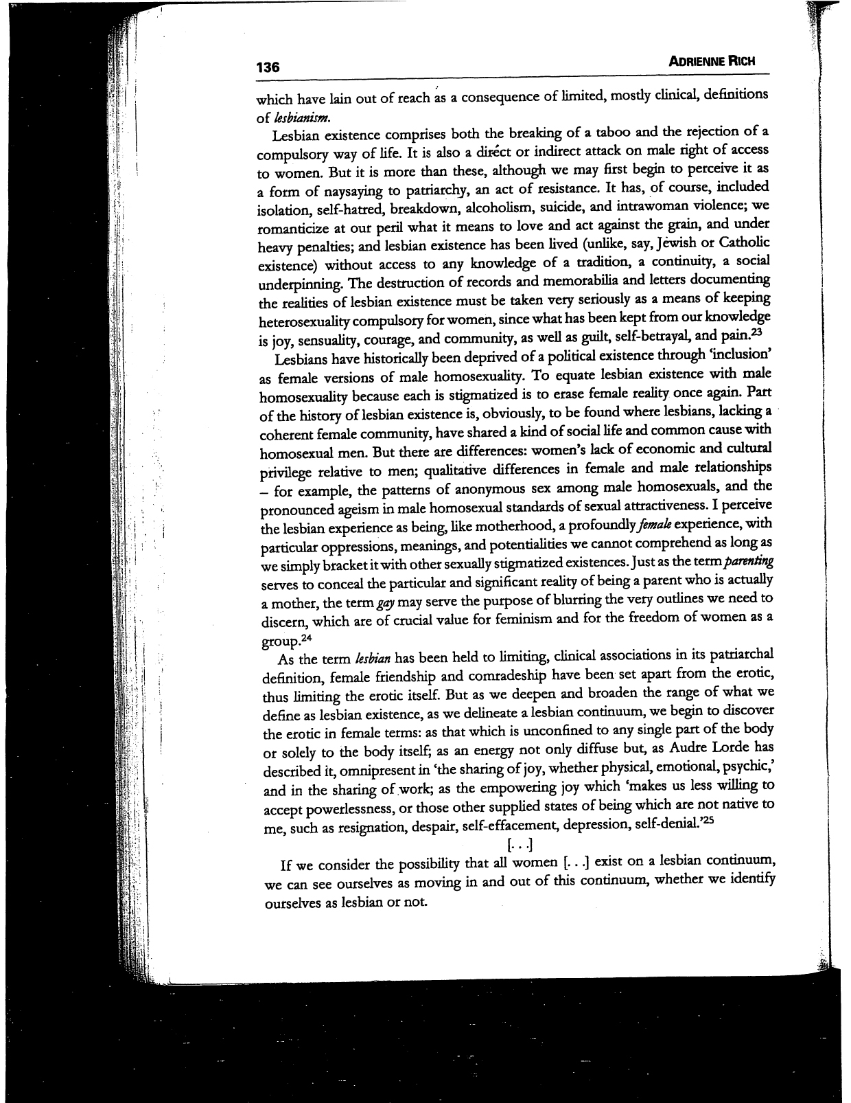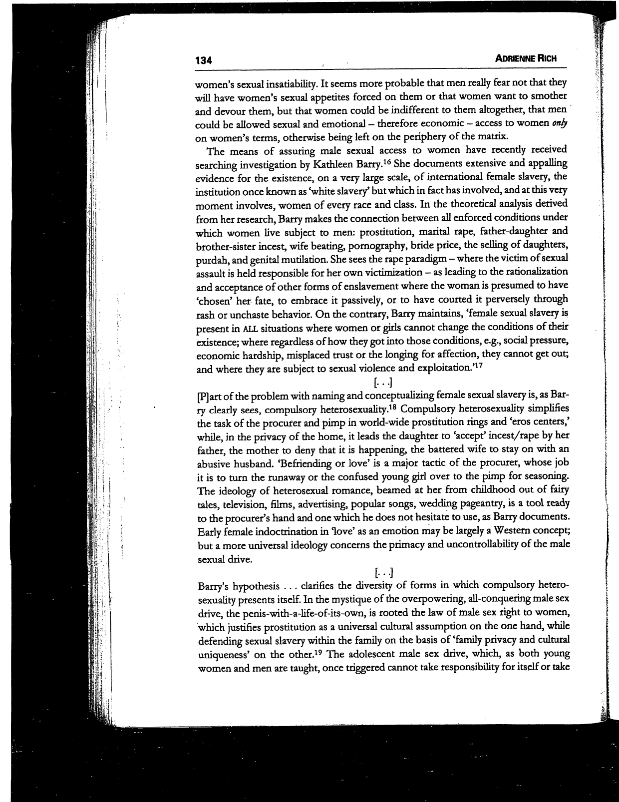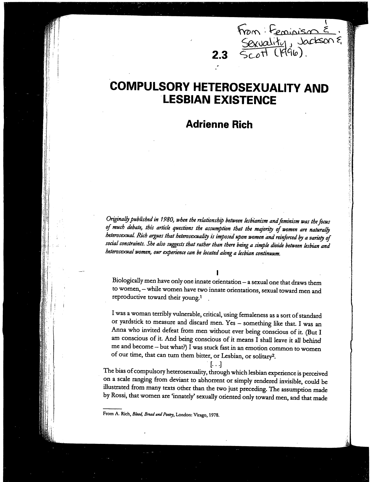 Adrienne Rich was an American poet, essayist, and a non-fiction writer. The selected essay is one of the first to address the theme of lesbian existence. She discusses where misogyny and homophobia intersect and how the enforcement of heterosexuality within a patriarcal society is specific to the lesbian experience. Even though this essay opened up new discussions and understandings regarding the oppression of women and lesbians, she is also very much criticized for her participation in incredibly transphobic and especially transmisogynist discourses.
