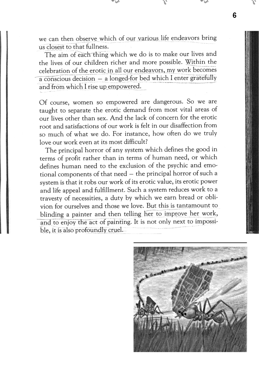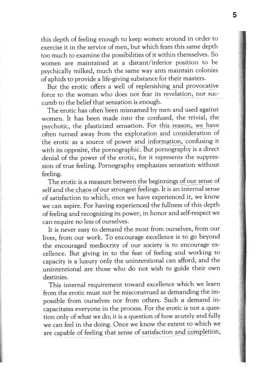 ‘Black, lesbian, mother, warrior, poet,’ was one of many ways Audre Lorde described herself. Her activist work is very much linked to her writing, and in the essay, she is formulating the importance of discovering the erotic power within ourselves????; ‘We need each one of us,’ as she put it when presenting the text at a reading, ‘to deal from a place where we are most powerful. And what I wanted to talk about today was the erotic as a source of that power, and how urgent it is that we recognise that within ourselves.’