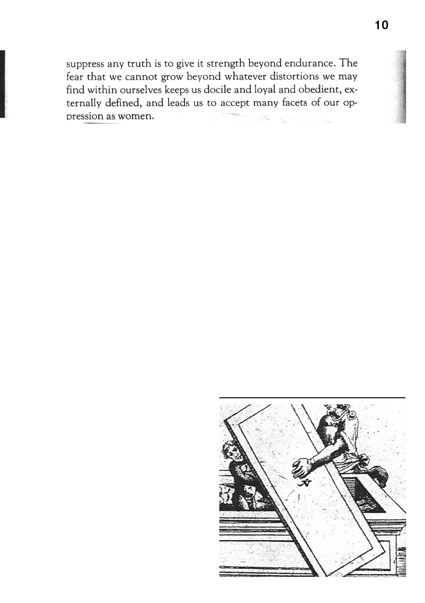 In the selected essay, Dodie Bellamy, writer and journalist, is describing her time as part of The Feminist Writers’ Guild in the U.S. during the eighties. It deals with the importance of meeting and having conversations in the physical presence of one another, and the idea that political change starts in the emergence of issues and actions of the small collective.