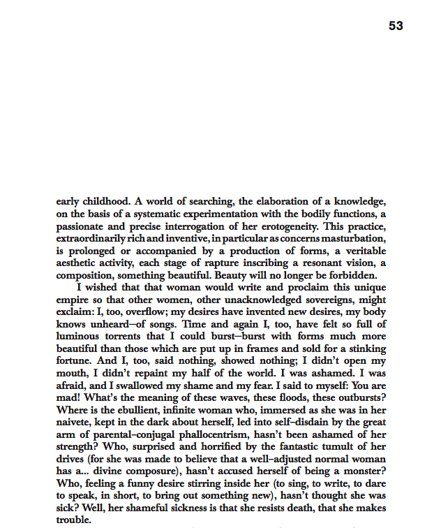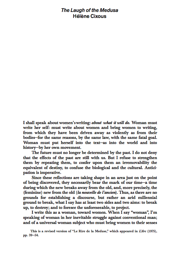 Hélène Cixous is a professor, writer, feminist, and founder of The University of Paris VIII. Her essay was first published in 1972 as ‘Le rire de la Méduse’ and made her well-known for her concepts of écriture feminine, described as a feminine mode of writing outside the patriarchal structures of language.