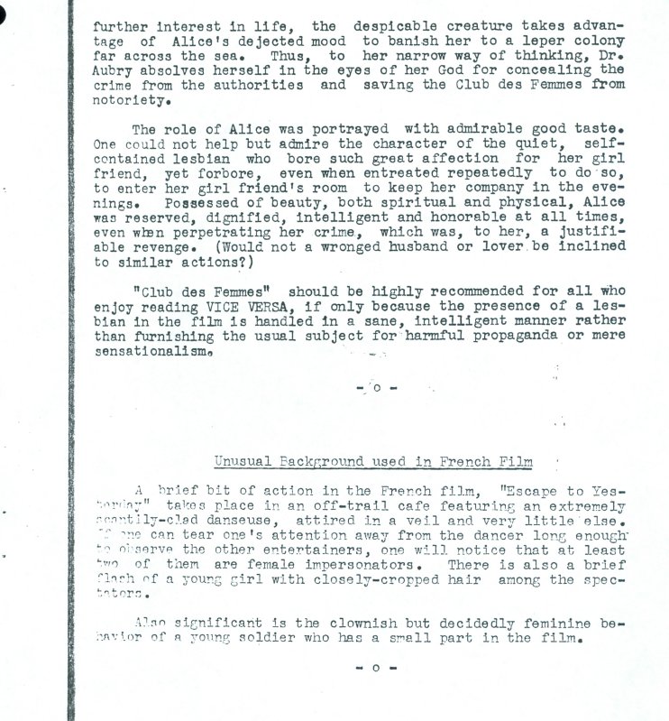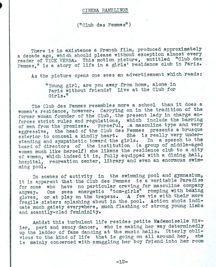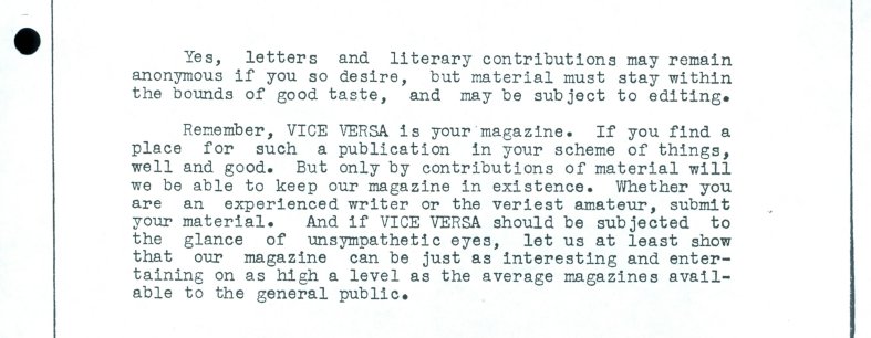 Vice Versa is the first known lesbian publication in the world. Lisa Ben, an American editor, author, and songwriter, wrote, edited, printed, and distributed the magazine for nine months in Los Angeles in the late 1940s. She produced it at her work place after her boss told her that she should always look busy, even when she had no work assigned.