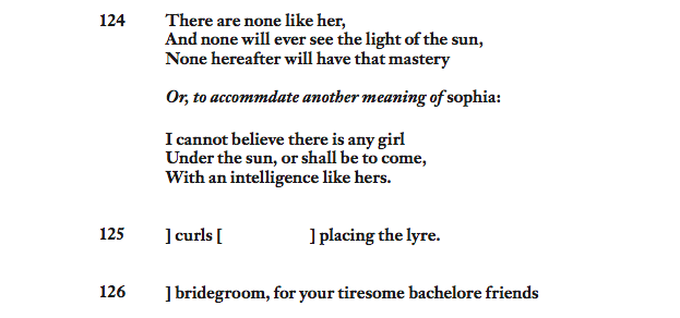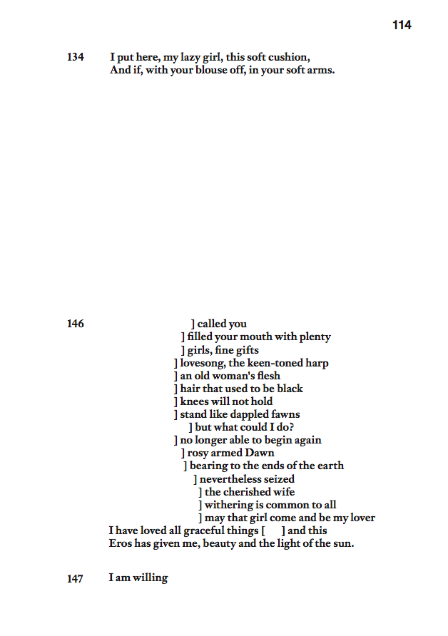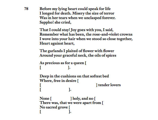 Sappho came from the island of Lesbos in Greece and wrote a large body of poetry, much of which reflected love between women. Most of her work is lost; the chosen fragments come from Guy Davenport’s translations of what is left from 2600 years ago. In the introduction to the translations, Davenport writes: ‘Spirit, for Sappho, shines from matter; one embraces the two together, inseparable. The world is to be loved.’