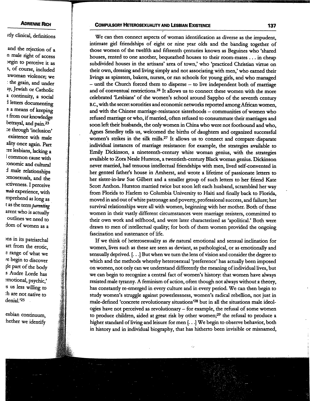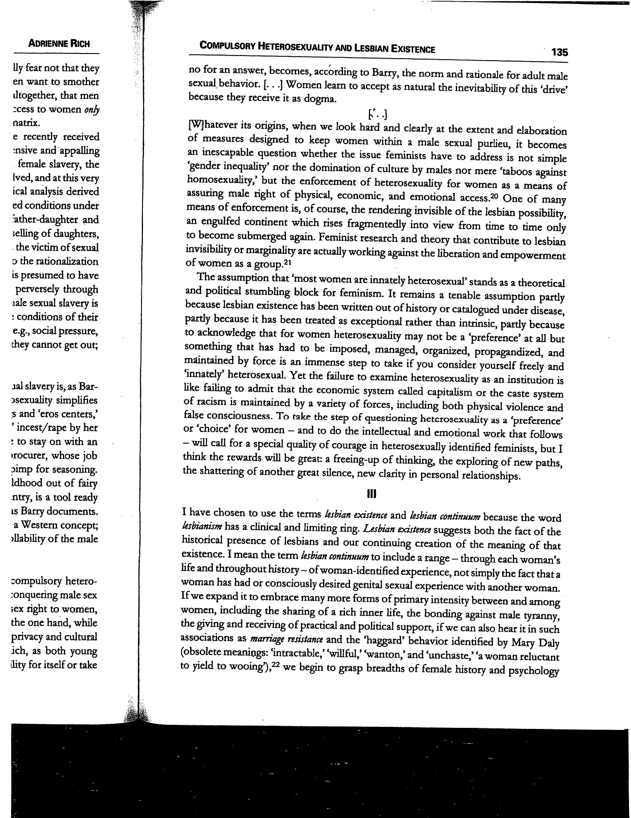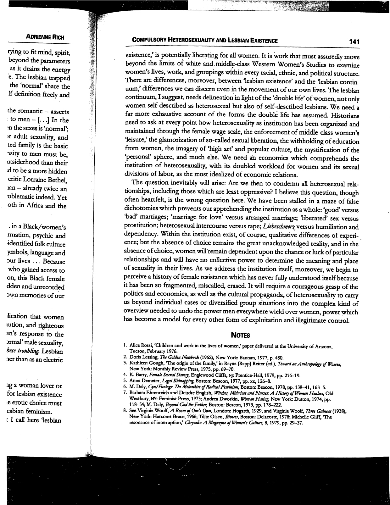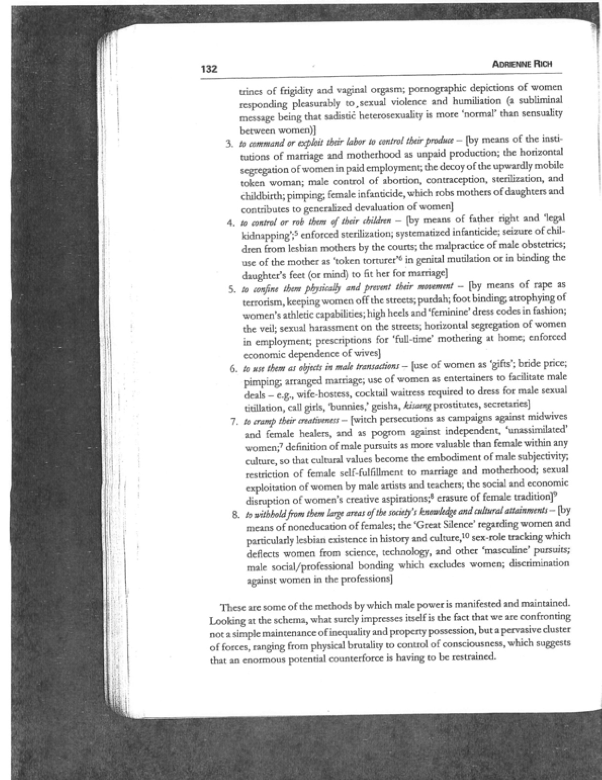 Adrienne Rich was an American poet, essayist, and a non-fiction writer. The selected essay is one of the first to address the theme of lesbian existence. She discusses where misogyny and homophobia intersect and how the enforcement of heterosexuality within a patriarcal society is specific to the lesbian experience. Even though this essay opened up new discussions and understandings regarding the oppression of women and lesbians, she is also very much criticized for her participation in incredibly transphobic and especially transmisogynist discourses.