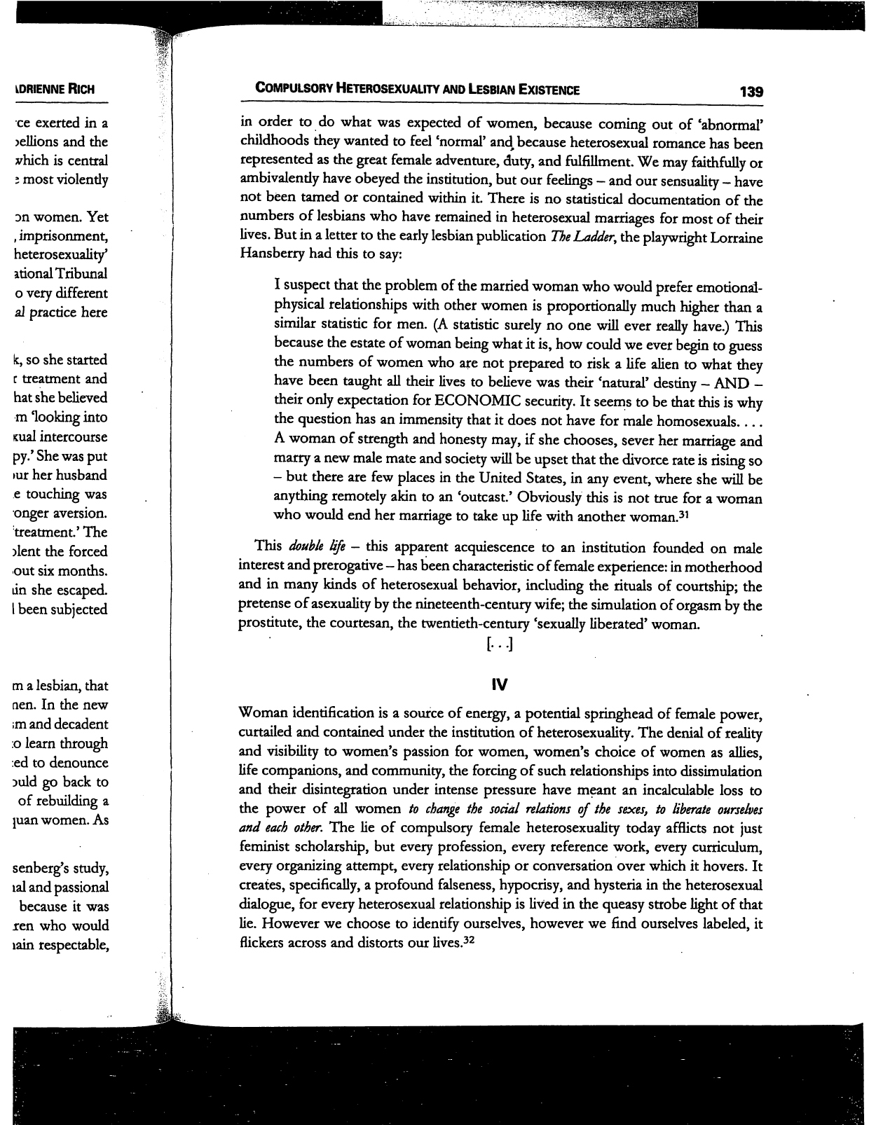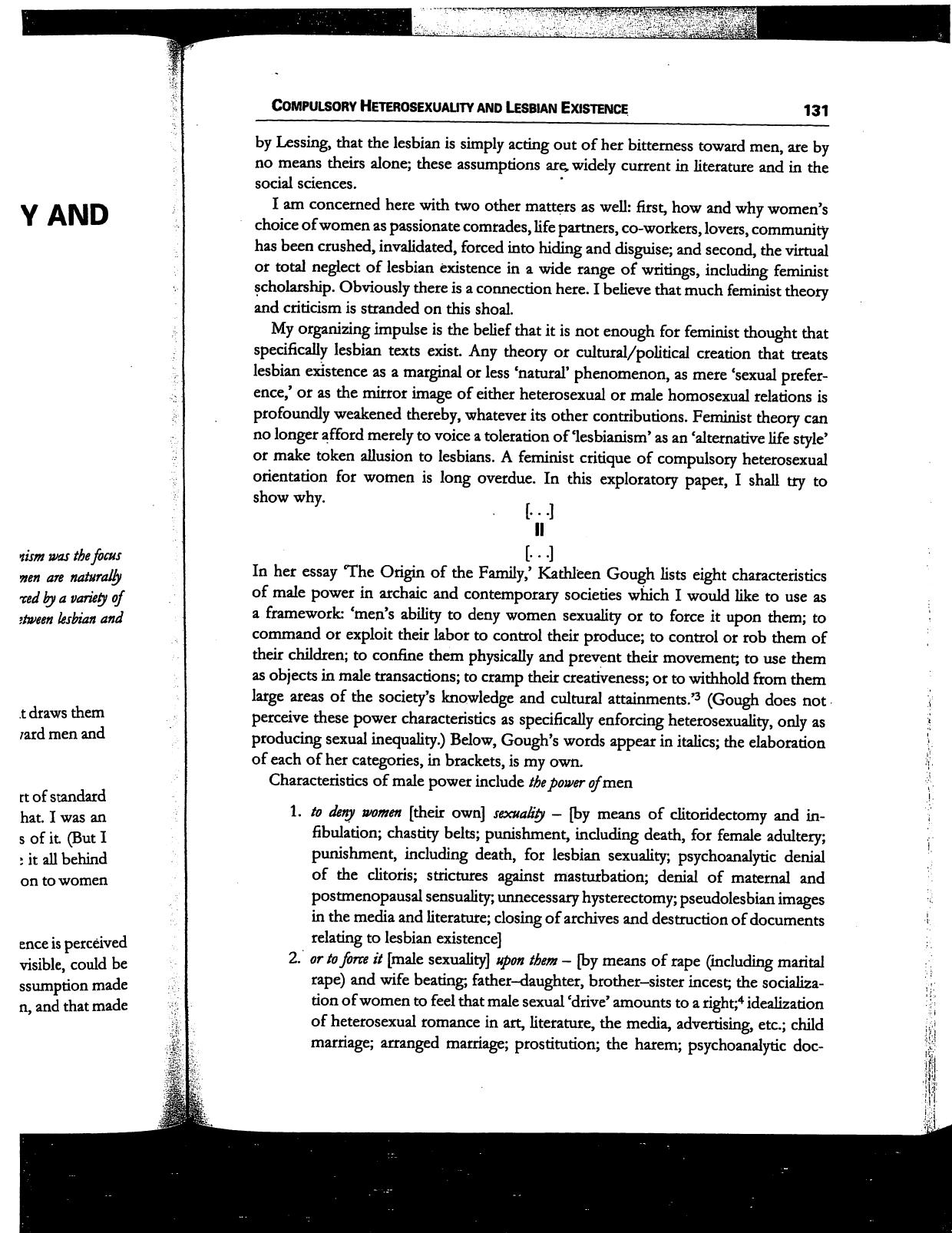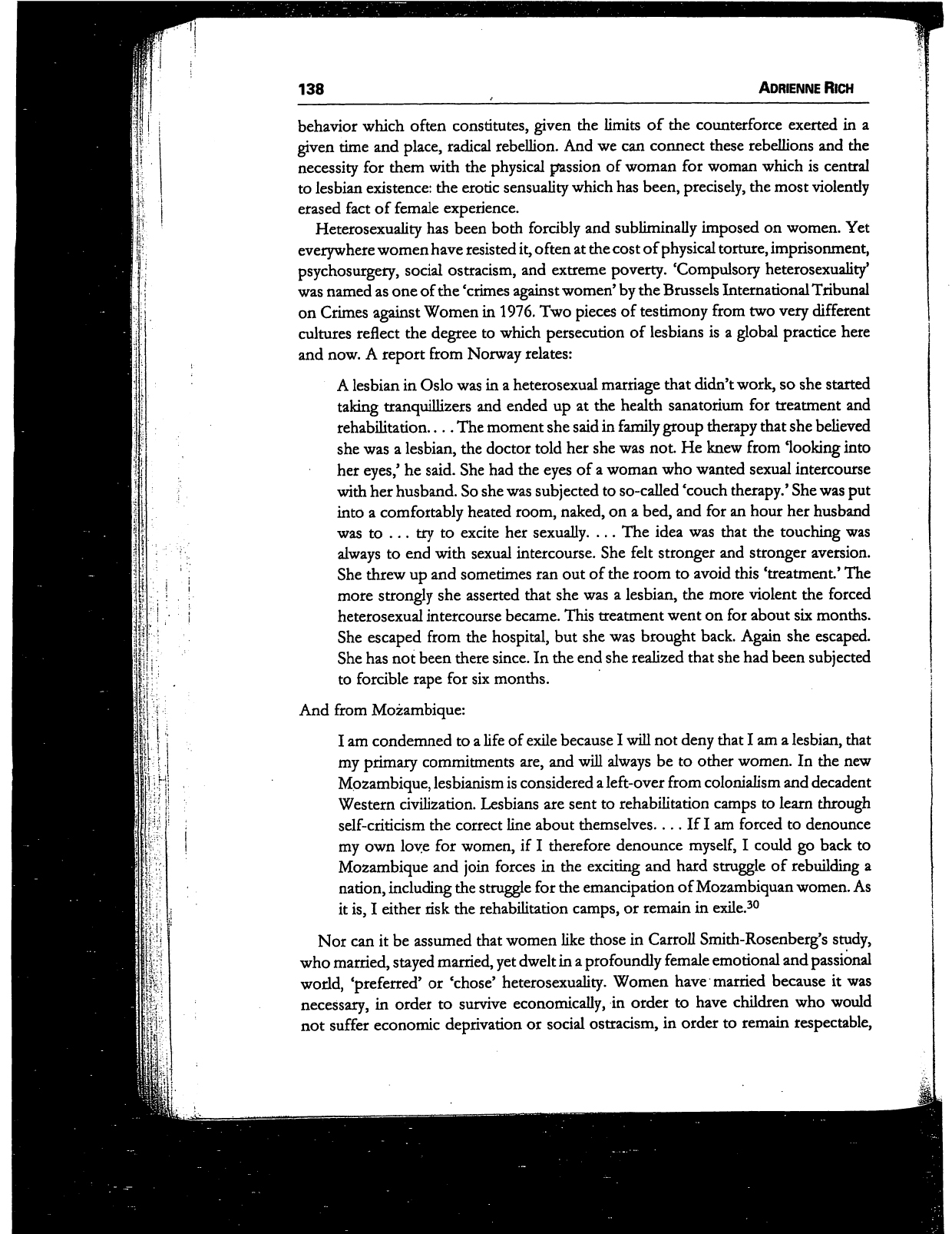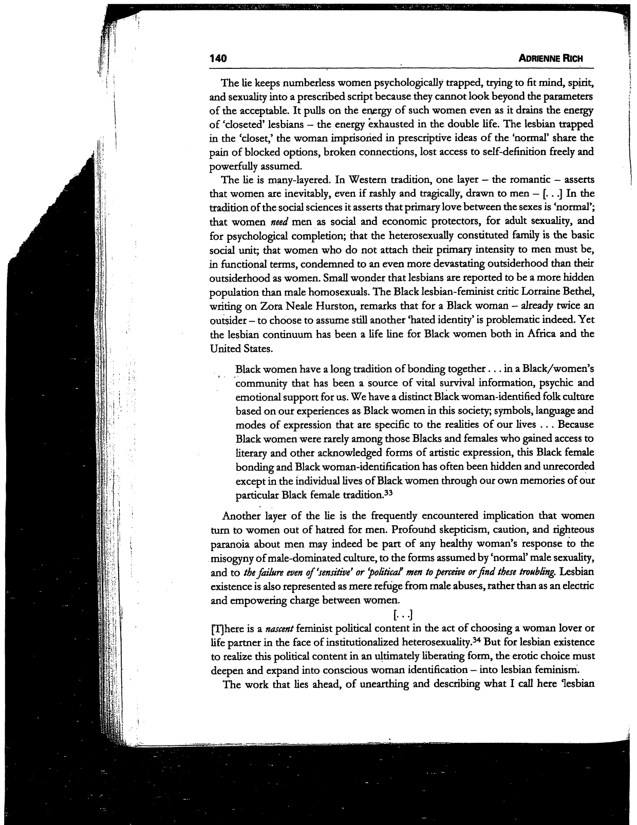 Adrienne Rich was an American poet, essayist, and a non-fiction writer. The selected essay is one of the first to address the theme of lesbian existence. She discusses where misogyny and homophobia intersect and how the enforcement of heterosexuality within a patriarcal society is specific to the lesbian experience. Even though this essay opened up new discussions and understandings regarding the oppression of women and lesbians, she is also very much criticized for her participation in incredibly transphobic and especially transmisogynist discourses.