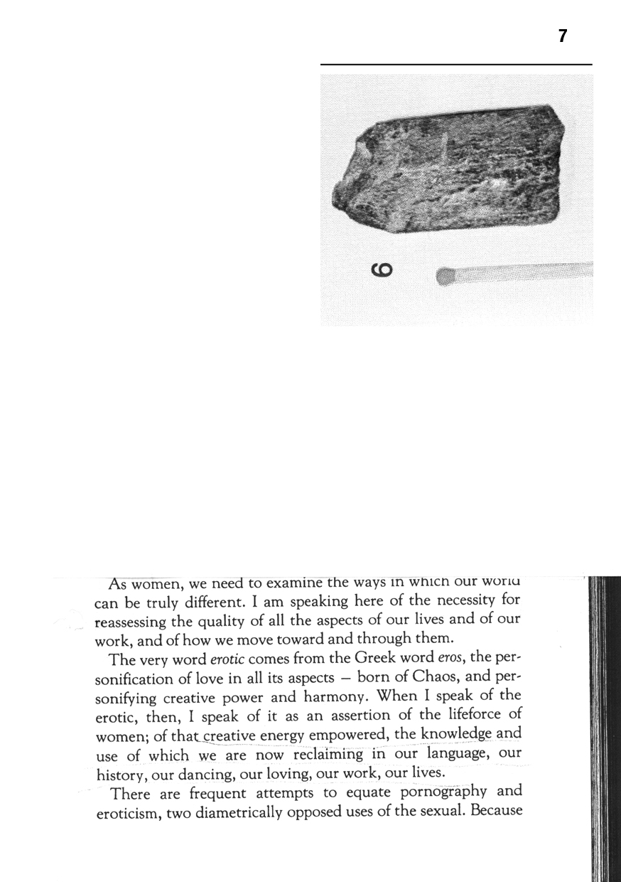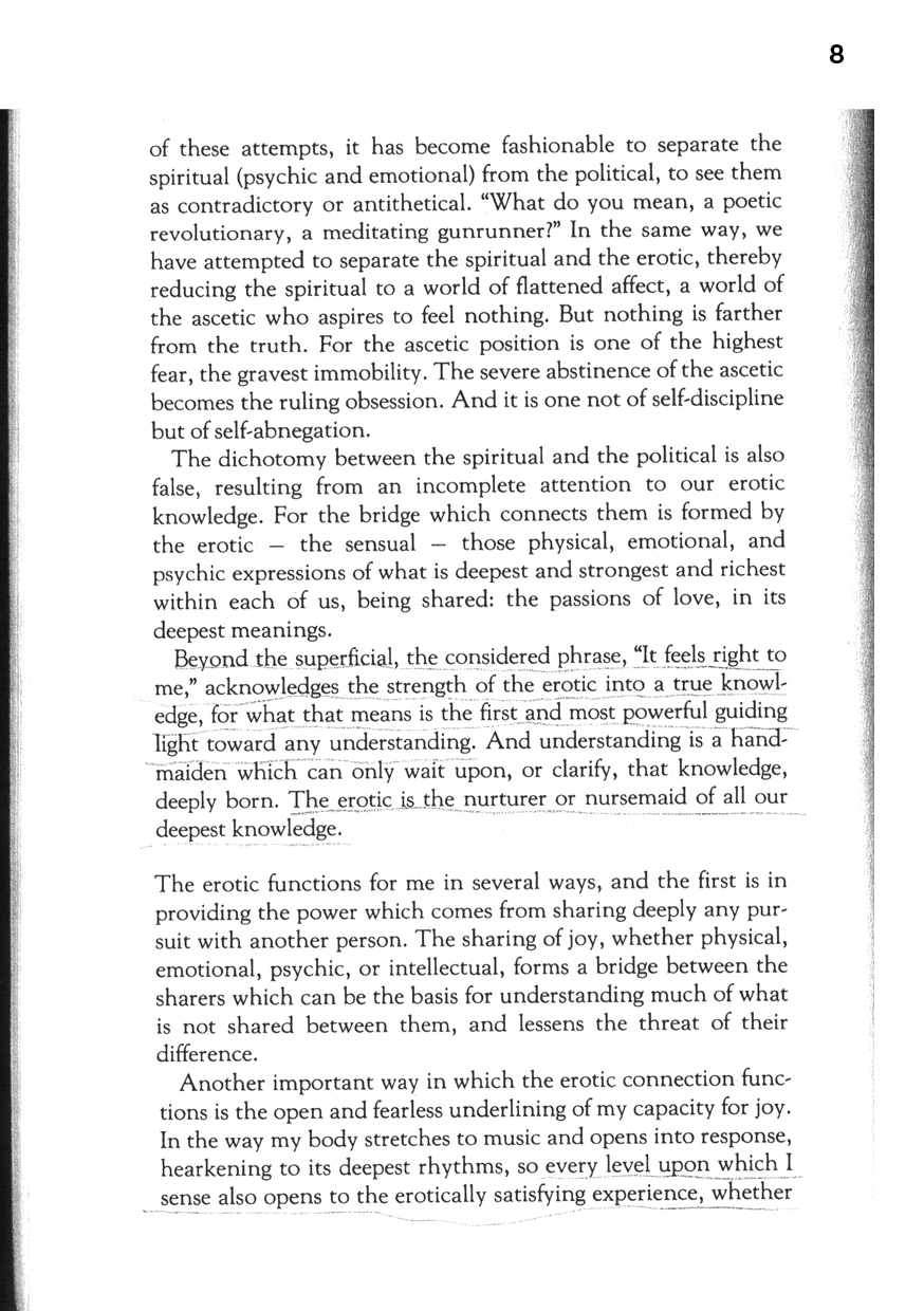‘Black, lesbian, mother, warrior, poet,’ was one of many ways Audre Lorde described herself. Her activist work is very much linked to her writing, and in the essay, she is formulating the importance of discovering the erotic power within ourselves????; ‘We need each one of us,’ as she put it when presenting the text at a reading, ‘to deal from a place where we are most powerful. And what I wanted to talk about today was the erotic as a source of that power, and how urgent it is that we recognise that within ourselves.’