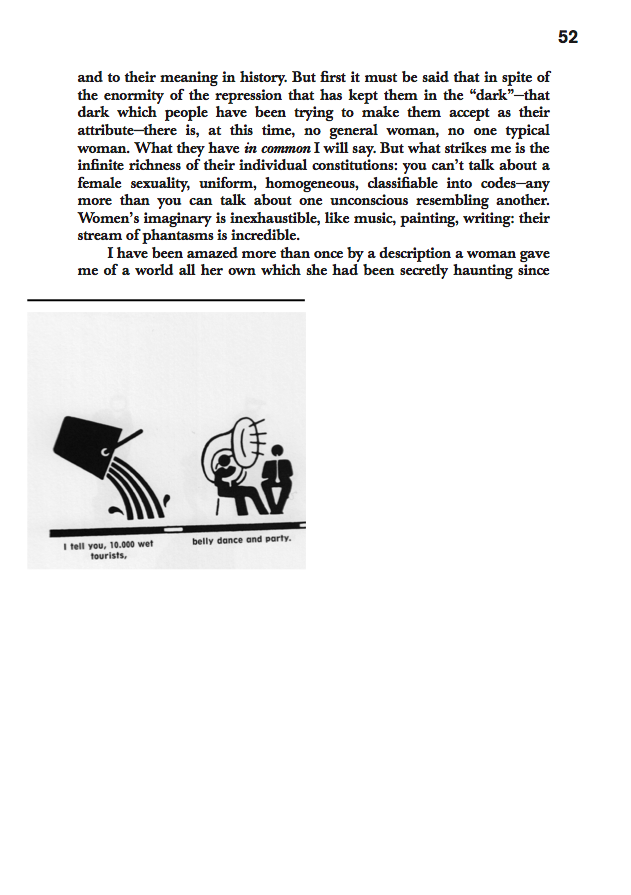 Hélène Cixous is a professor, writer, feminist, and founder of The University of Paris VIII. Her essay was first published in 1972 as ‘Le rire de la Méduse’ and made her well-known for her concepts of écriture feminine, described as a feminine mode of writing outside the patriarchal structures of language.