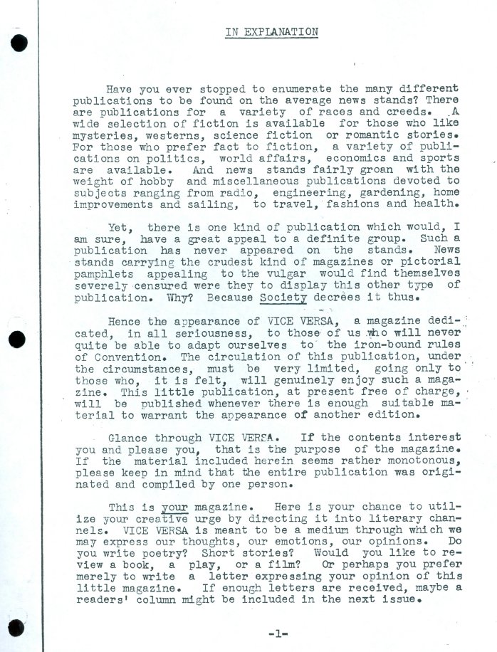 Vice Versa is the first known lesbian publication in the world. Lisa Ben, an American editor, author, and songwriter, wrote, edited, printed, and distributed the magazine for nine months in Los Angeles in the late 1940s. She produced it at her work place after her boss told her that she should always look busy, even when she had no work assigned.