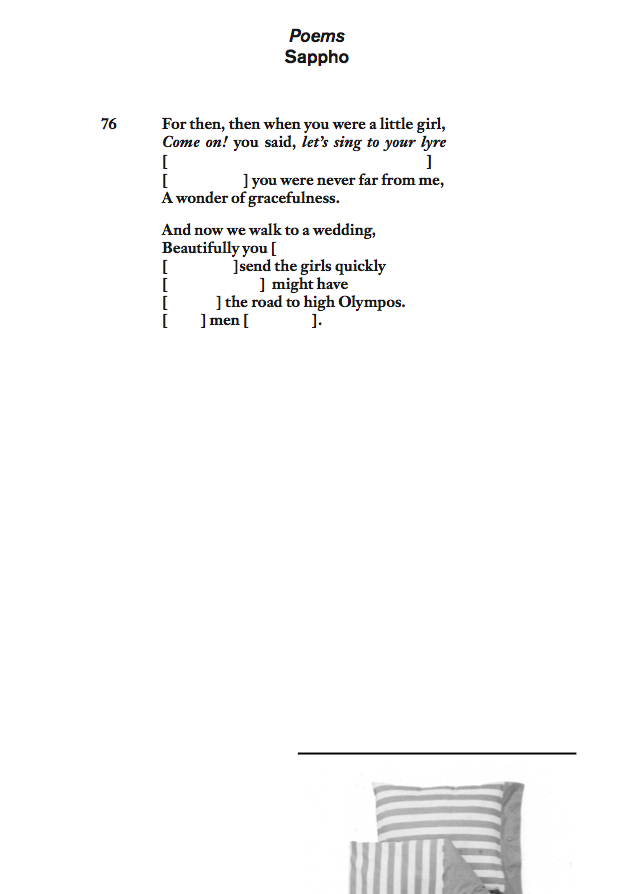 Sappho came from the island of Lesbos in Greece and wrote a large body of poetry, much of which reflected love between women. Most of her work is lost; the chosen fragments come from Guy Davenport’s translations of what is left from 2600 years ago. In the introduction to the translations, Davenport writes: ‘Spirit, for Sappho, shines from matter; one embraces the two together, inseparable. The world is to be loved.’